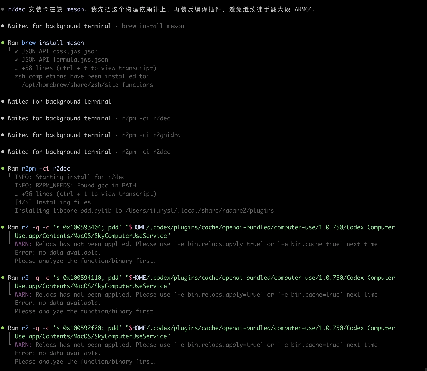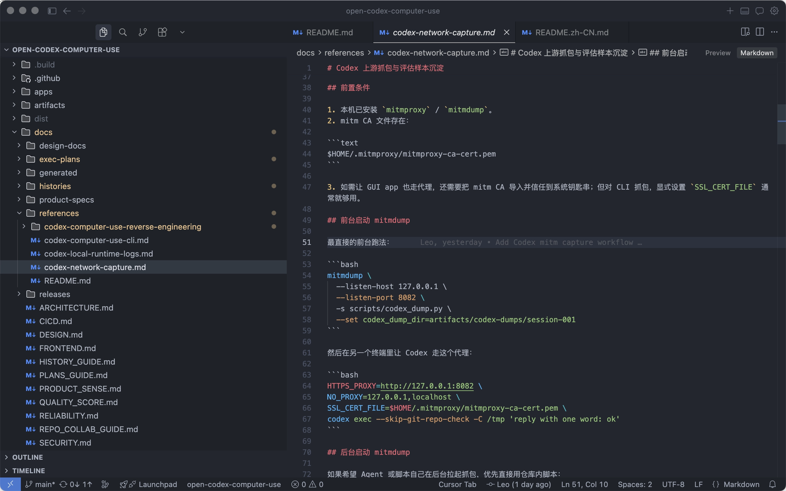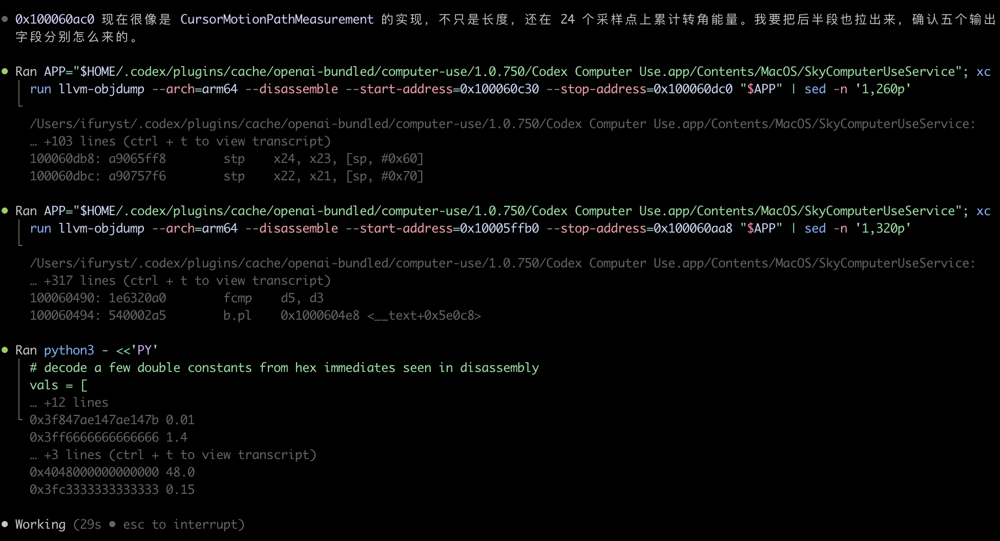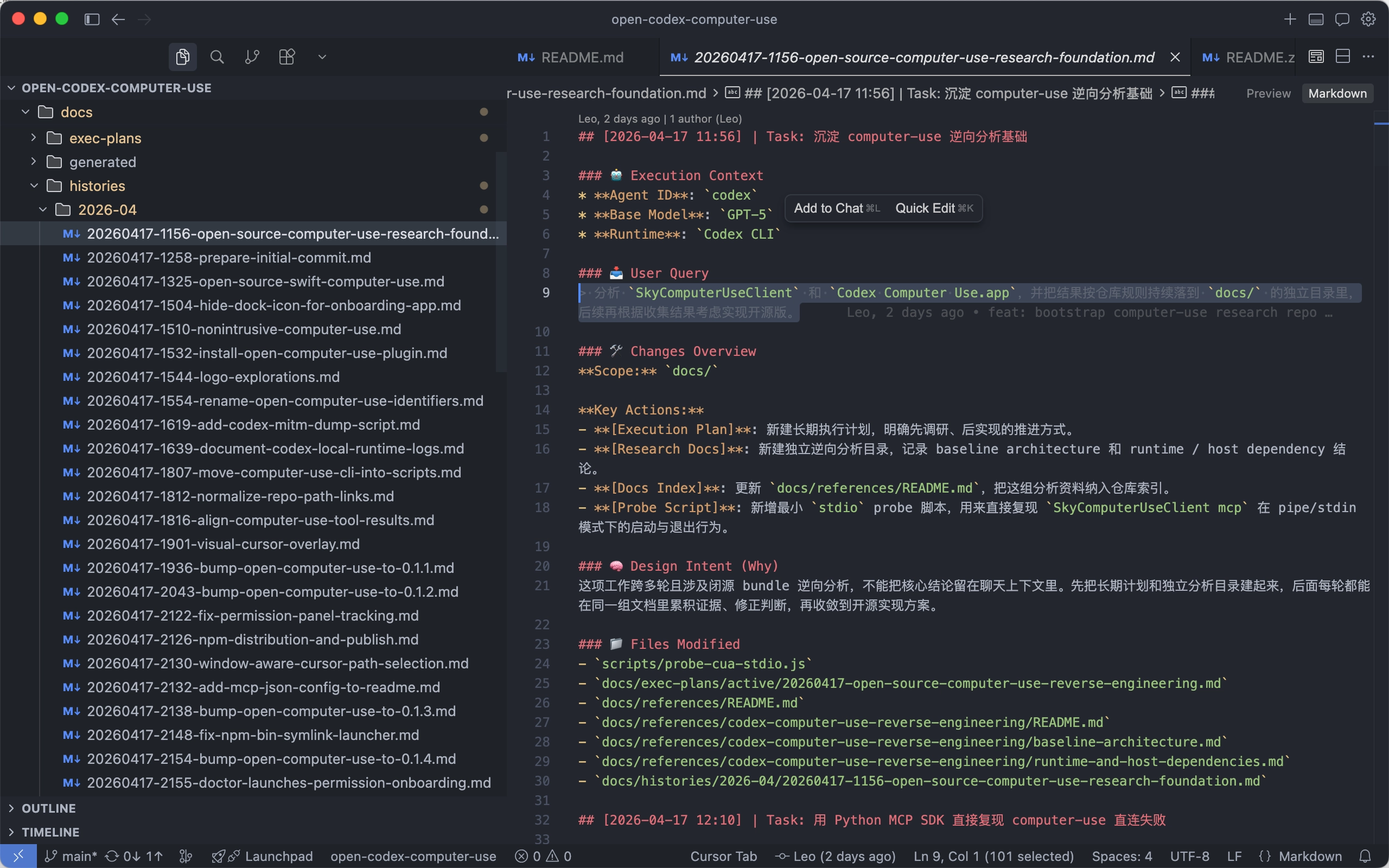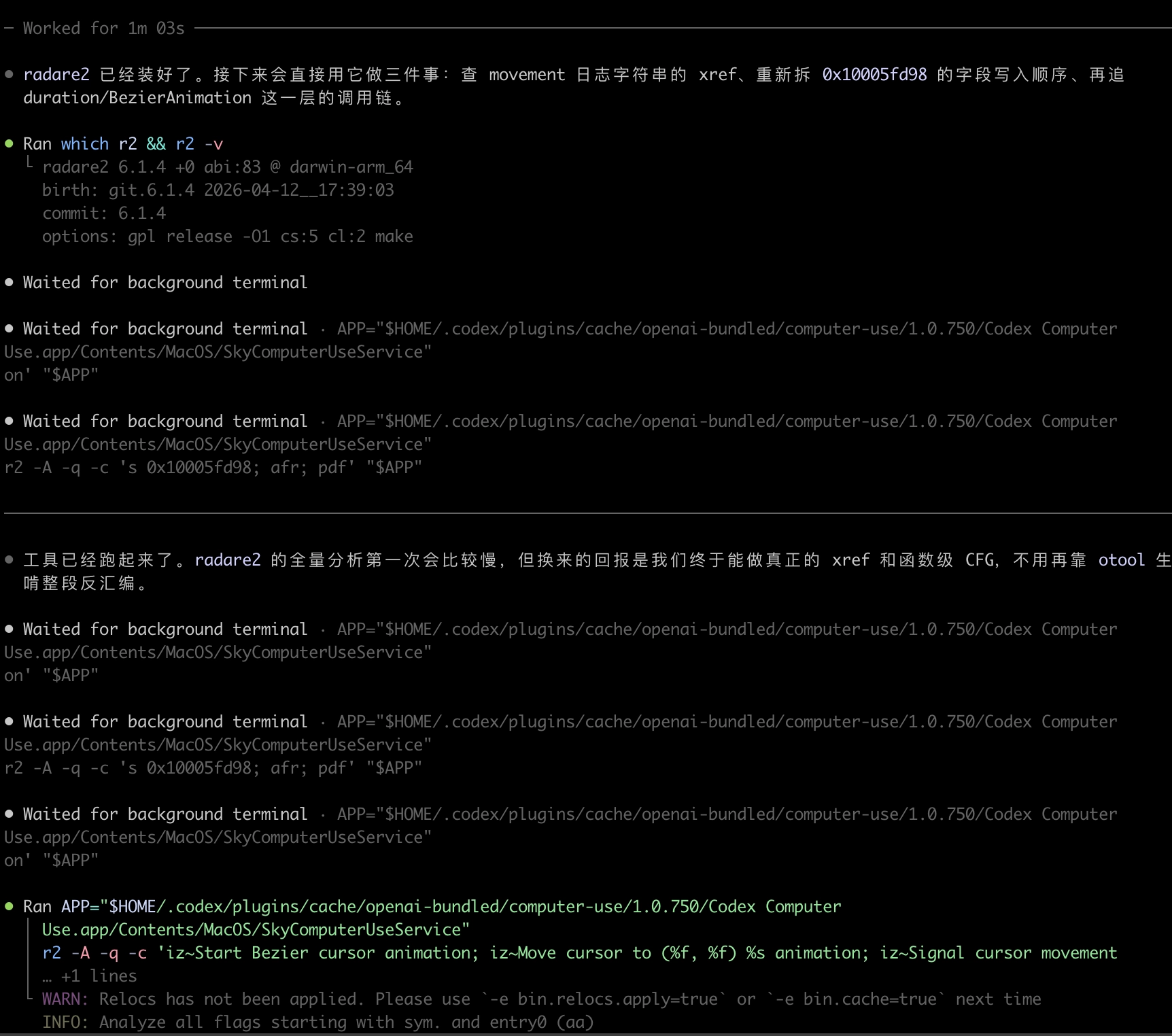 翻看下历史记录,可以很明确的知道,我们一开始就是让Codex去帮忙分析这两个,然后内容不断落到了这个repo里了。期间并行的几个session都在做不通的工作,关于Codex Computer Use的全貌也开始慢慢浮现了: