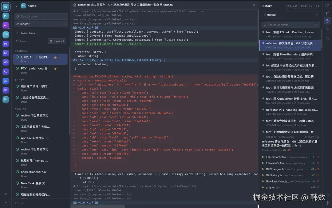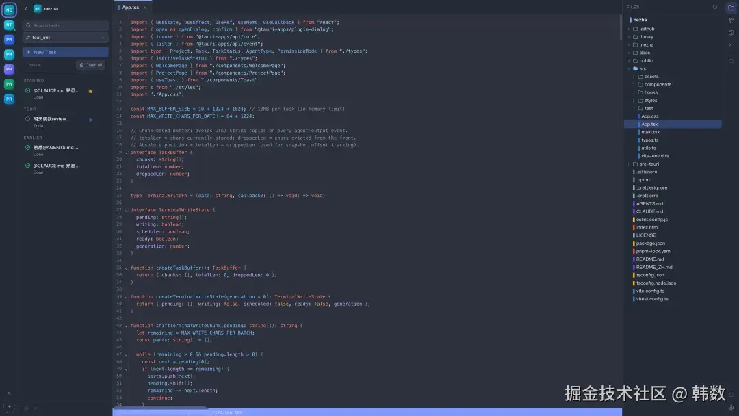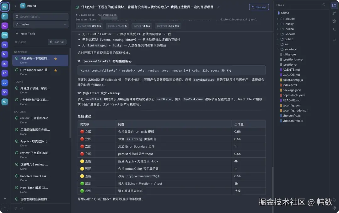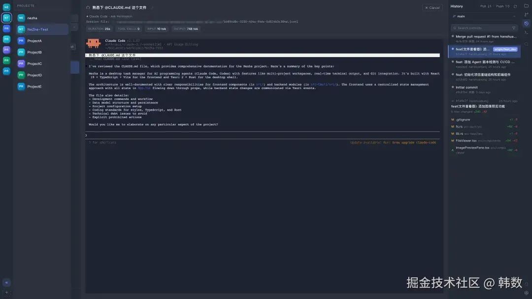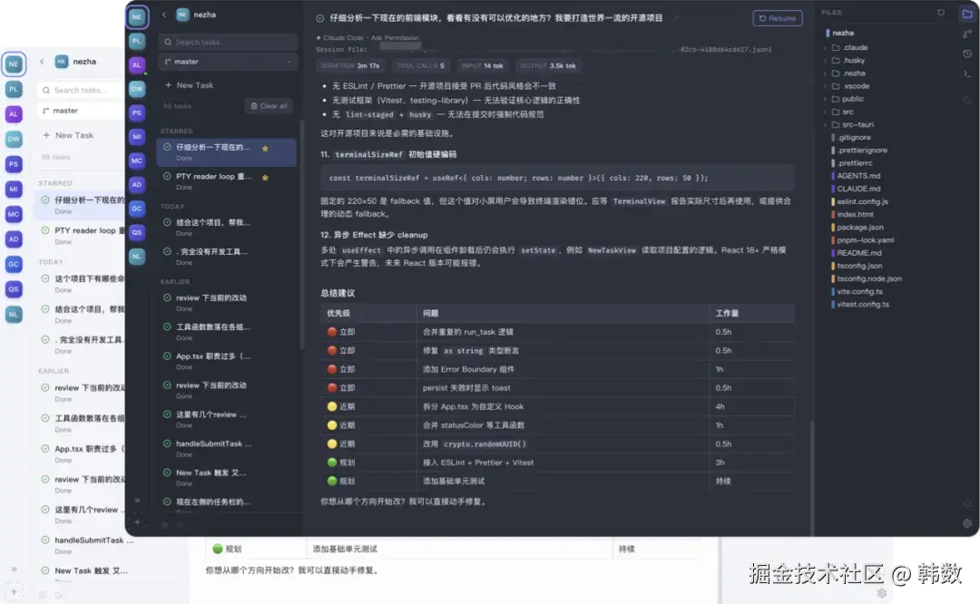 NeZha 的中间部分是一个虚拟终端,这个虚拟终端也是整个开发过程中最让我头疼的地方,直到现在我也没有把它做的很满意。终端会自动启动对应的 Code Agent, 并追加提示词,所以在开发的过程是是和平常的体验是一致的。左侧的话可以在多个项目见切换,切换之后原来的终端会自动在后台继续工作,直到任务完成或者需要你确认。